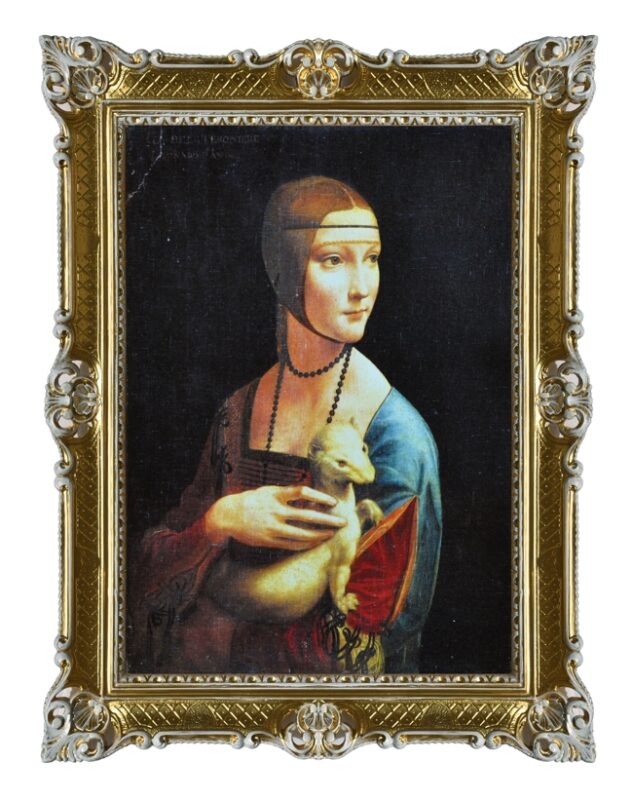 STAMPA SU CARTA LEONARDO DA VINCI LA DAMA CON L’ERMELLINO CON CORNICE STILE BAROCCO CM 86×67